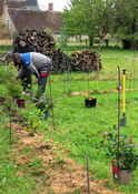 Plantation des nouveaux rosiers et tagetes, entretien et paillage de la roseraie par Cédric, Sandrine et Flora, ce samedi 11 avril.